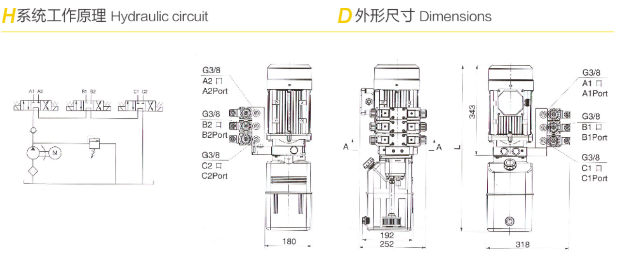此液壓動力單元集成了高壓齒輪泵、電機、液壓閥、中央油路閥塊、油箱等原件,可實現多組雙作用油缸的單獨動作。